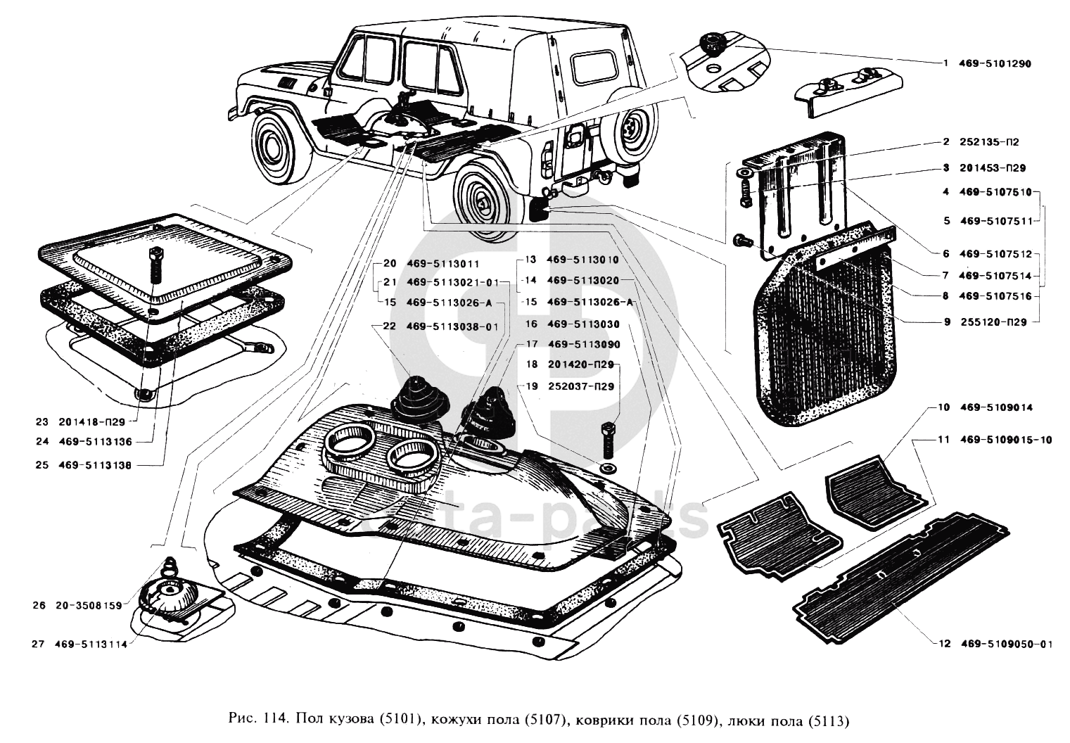Пол кузова, кожухи пола, коврики пола, люки пола УАЗ 3151