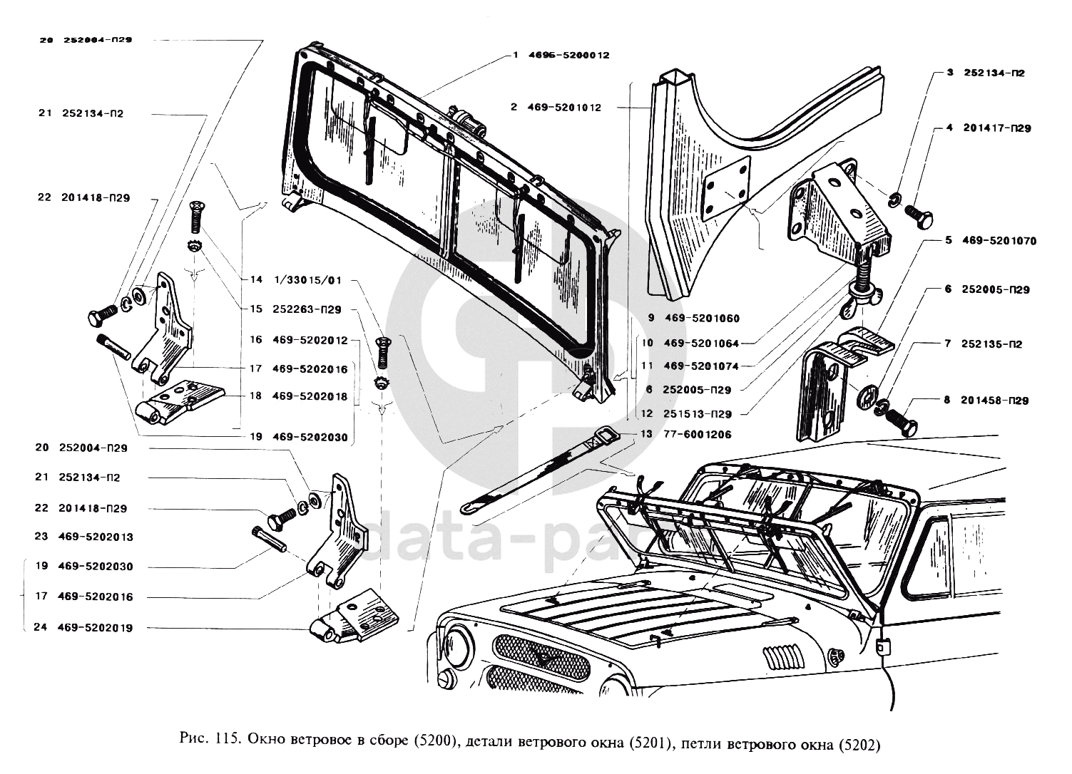 Окно ветровое, детали ветрового окна и петли ветрового окна УАЗ 3151