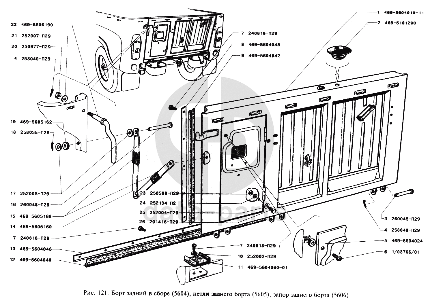 Борт задний в сборе, петли заднего борта, запор заднего борта УАЗ 3151