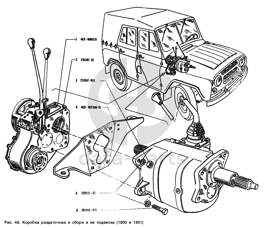 Коробка раздаточная в сборе и ее подвеска УАЗ 3151