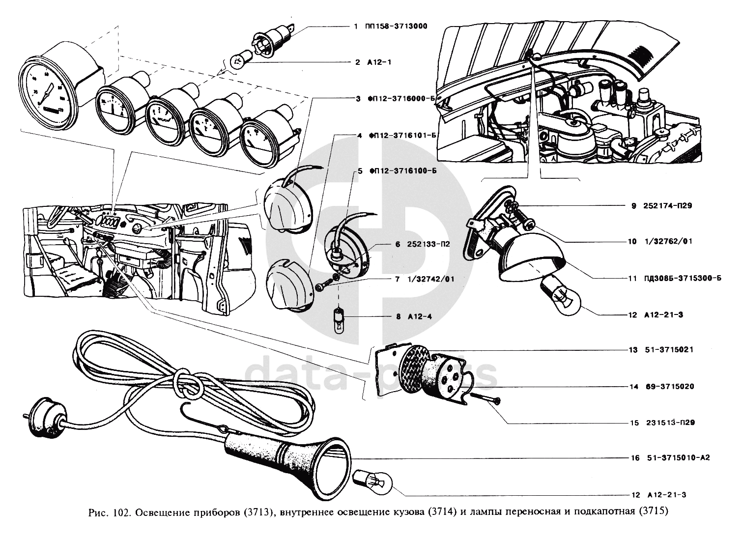 Освещение приборов, освещение кузова внутреннее и лампы переносная и подкапотная УАЗ 3151