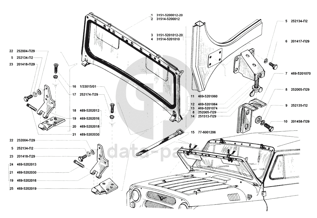 Окно ветровое в сборе, детали ветрового окна, петли ветрового окна УАЗ 31512