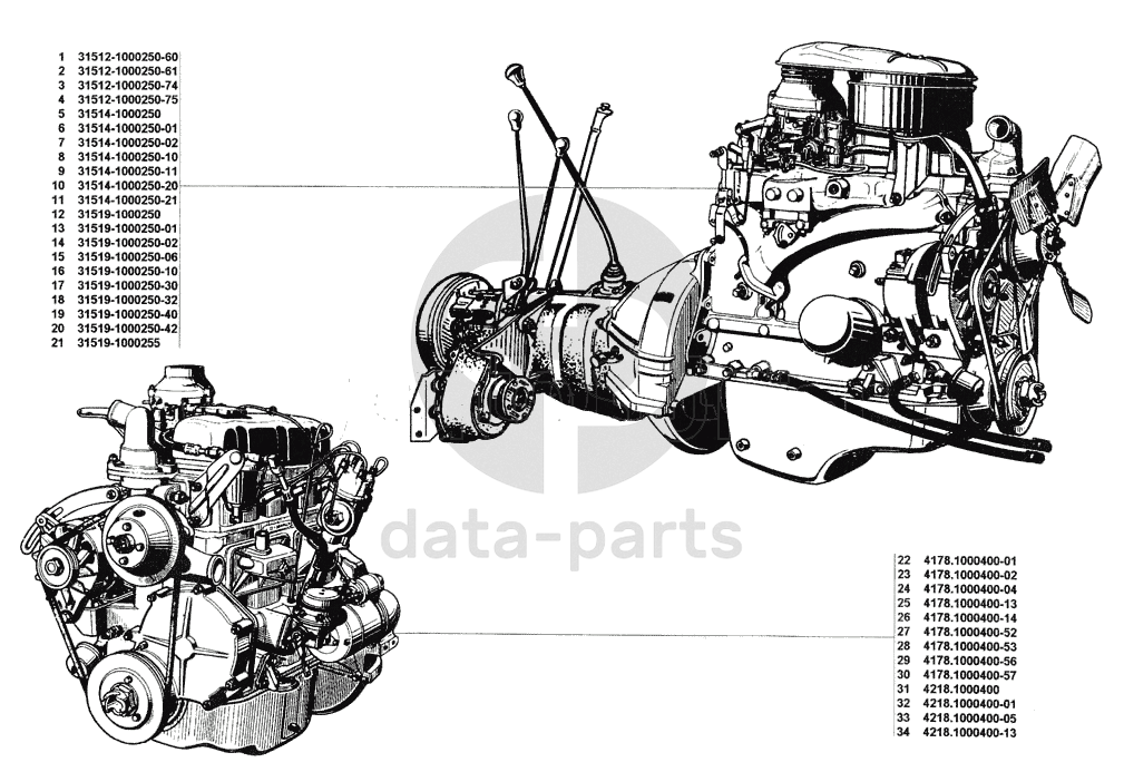 Двигатель в сборе с оборудованием (карбюратор 4178, насос системы охлаждения 421, уплотнение заднего конца коленчатого вала сальниковой набивкой)