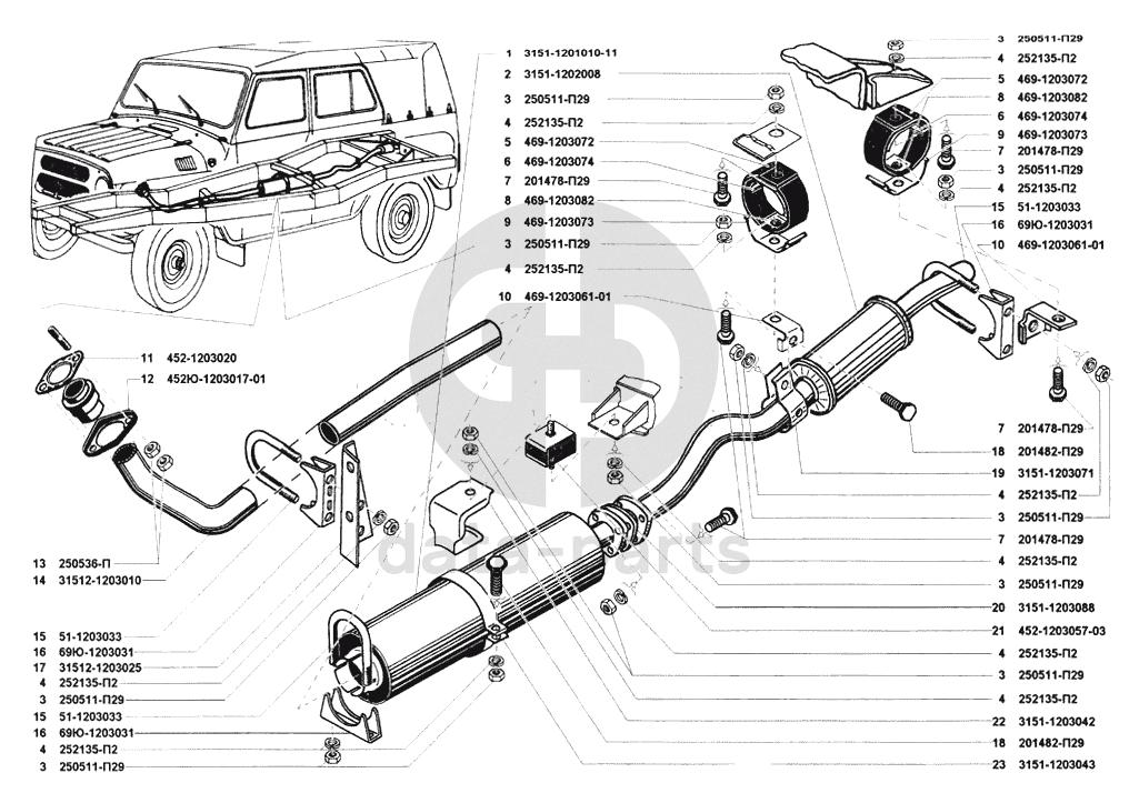 Глушитель выхлопа, резонатор, трубы и подвеска глушителя выхлопа УАЗ 31512