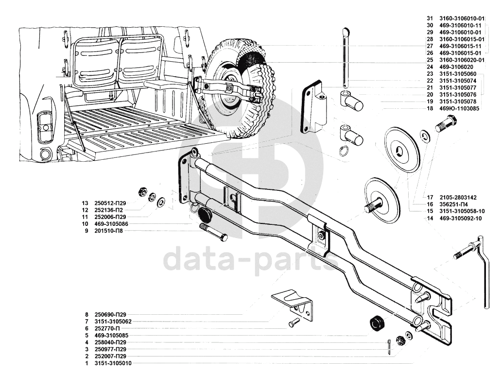 Держатель запасного колеса, покрышки и камеры УАЗ 31512