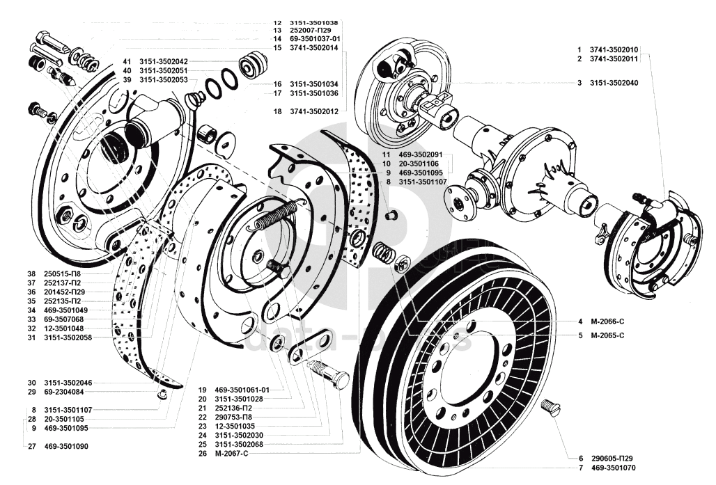 Тормоза рабочие задние и тормозные барабаны УАЗ 31512