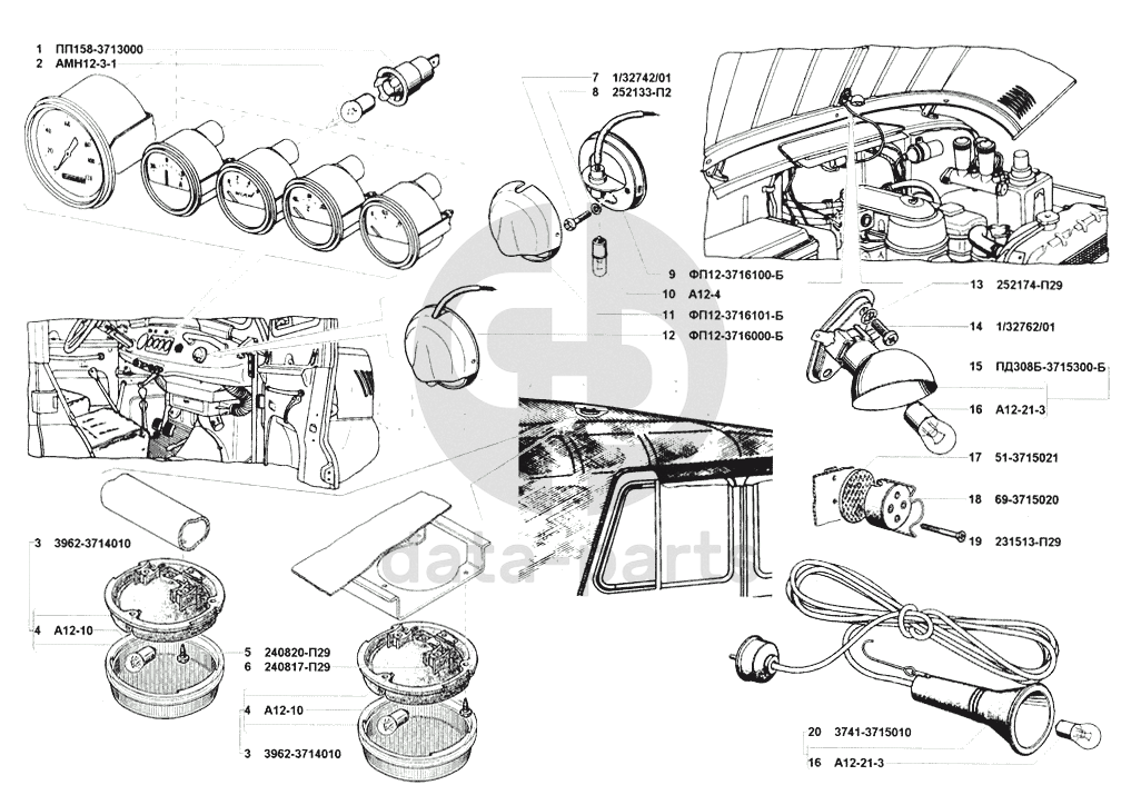Патроны ламп, освещение кузова внутреннее, лампы переносная и подкапотная УАЗ 31512