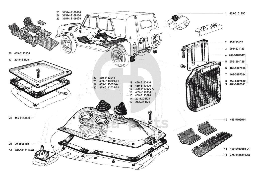Пол кузова, кожухи пола, коврики пола, люки пола УАЗ 31514