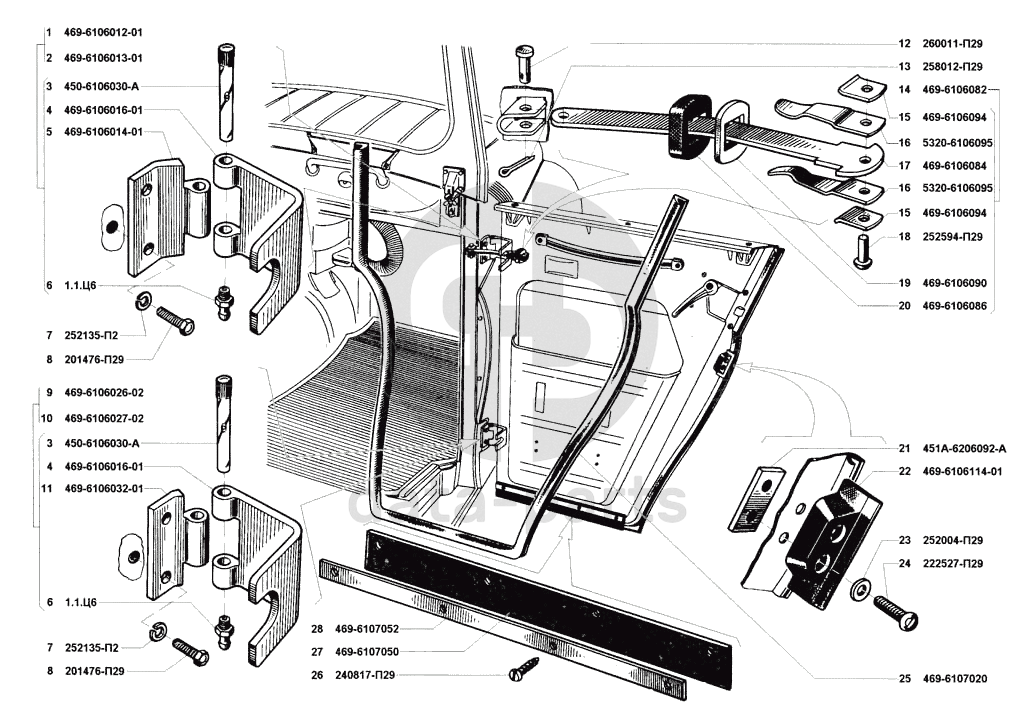 Навеска передней и задней дверей, уплотнения передней и задней дверей УАЗ 31514
