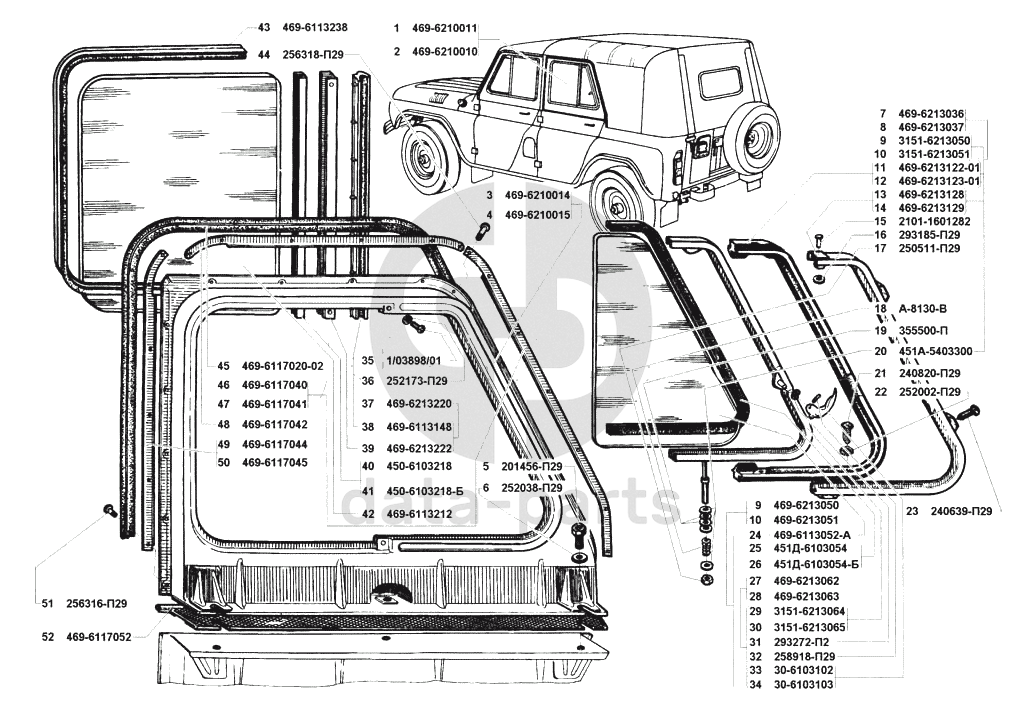 Надставка задней двери в сборе, окно надставки задней двери, уплотнение надставки задней двери УАЗ 31514
