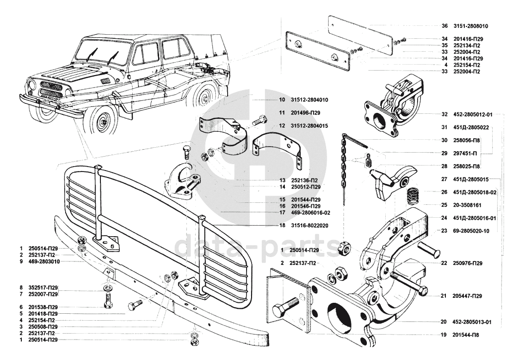 Бампер передний, бампер задний, прибор буксирный, крепление переднего номерного знака, крепление заднего номерного знака УАЗ 31514