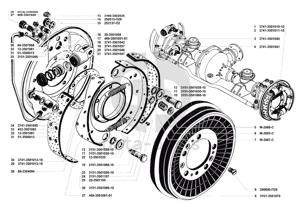 Тормоза рабочие передние и тормозные барабаны УАЗ 31514