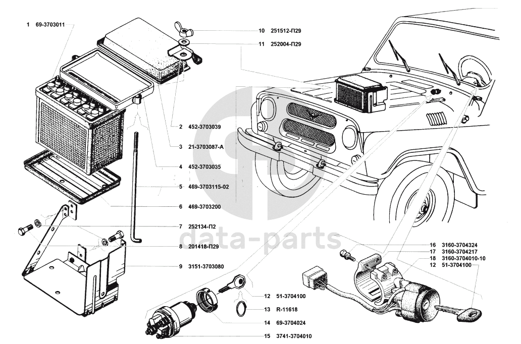 Батарея аккумуляторная, выключатель зажигания УАЗ 31514