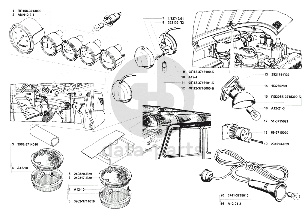 Патроны ламп, освещение кузова внутреннее, лампы переносная и подкапотная УАЗ 31514