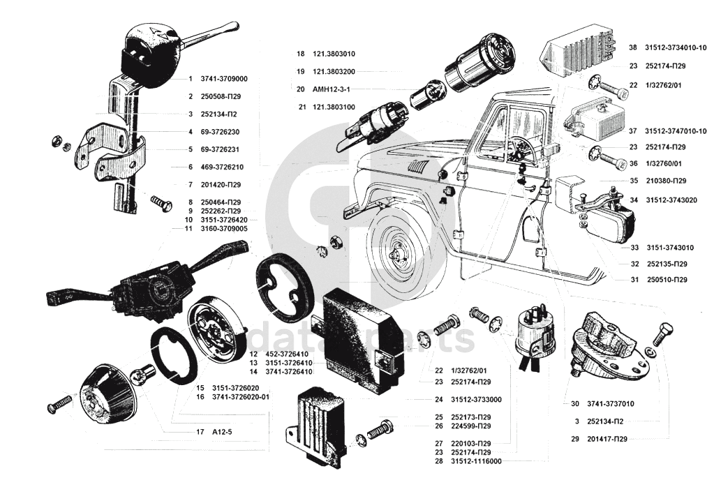 Указатели поворота, устройства блокировочные, коммутатор, выключатель "массы", противотуманные фары и вибратор аварийный УАЗ 31514