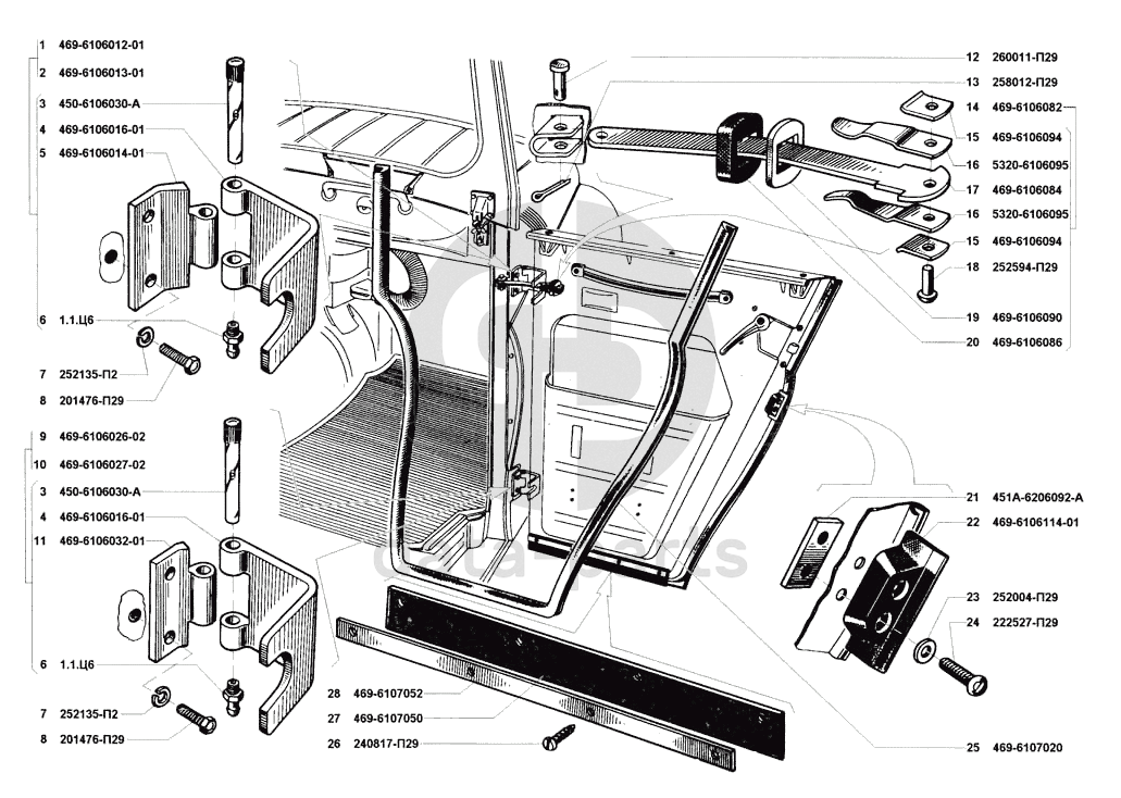 Навеска передней и задней дверей, уплотнения передней и задней дверей УАЗ 31519