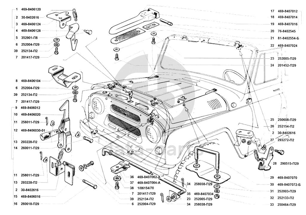 Замок и привод замка капота, навеска и упор капота УАЗ 31519