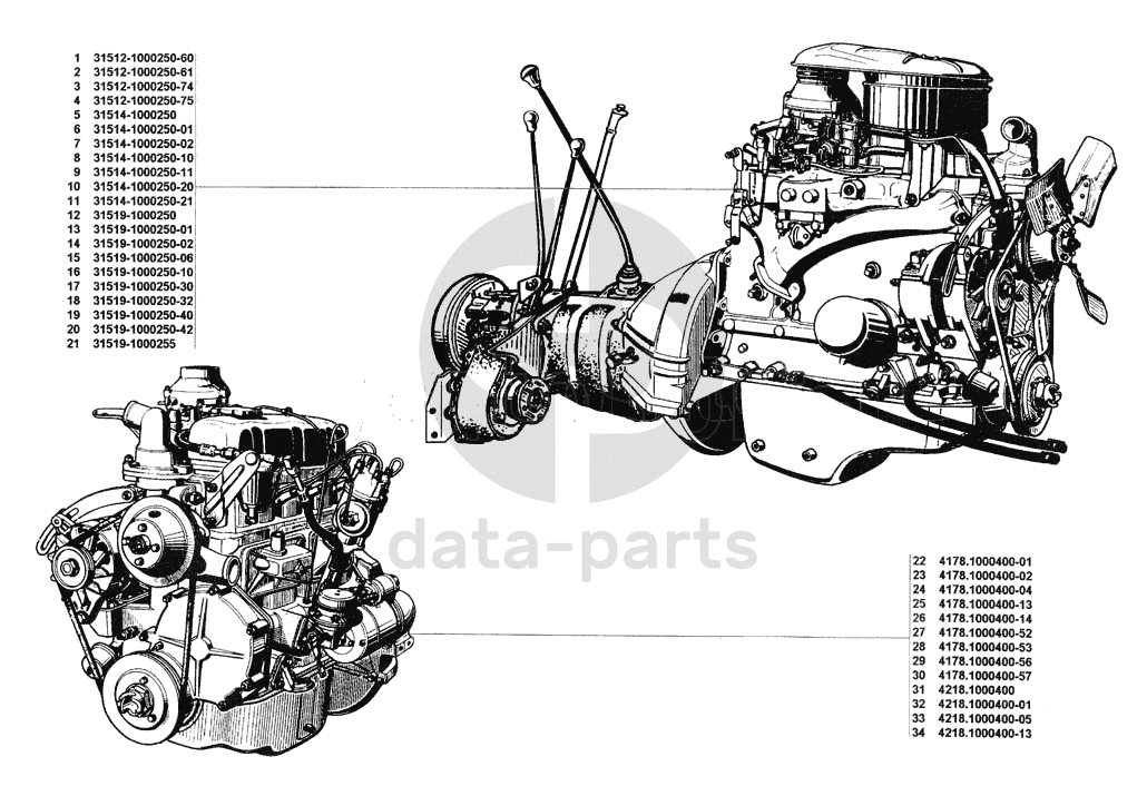 Двигатель в сборе с оборудованием (карбюратор 4178, насос системы охлаждения 421, уплотнение заднего конца коленчатого вала сальниковой набивкой)