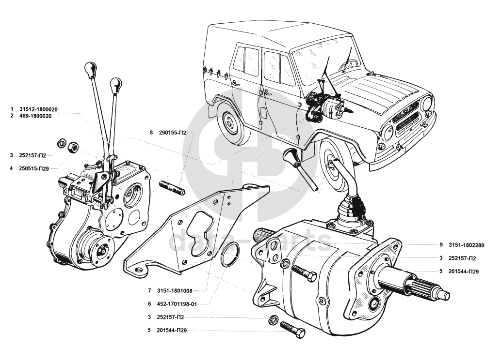Коробка раздаточная в сборе и подвеска раздаточной коробки УАЗ 31519