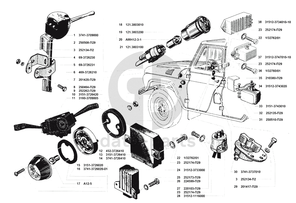 Указатели поворота, устройства блокировочные, коммутатор, выключатель "массы", противотуманные фары и вибратор аварийный УАЗ 31519