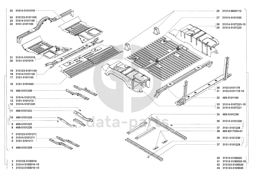 Основание в сборе, каркас, кожухи пола УАЗ 31519