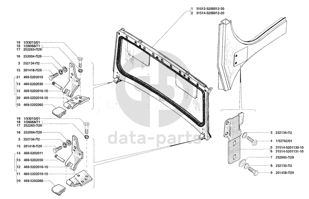 Окно ветровое в сборе, детали ветрового окна, петли ветрового окна УАЗ 31519