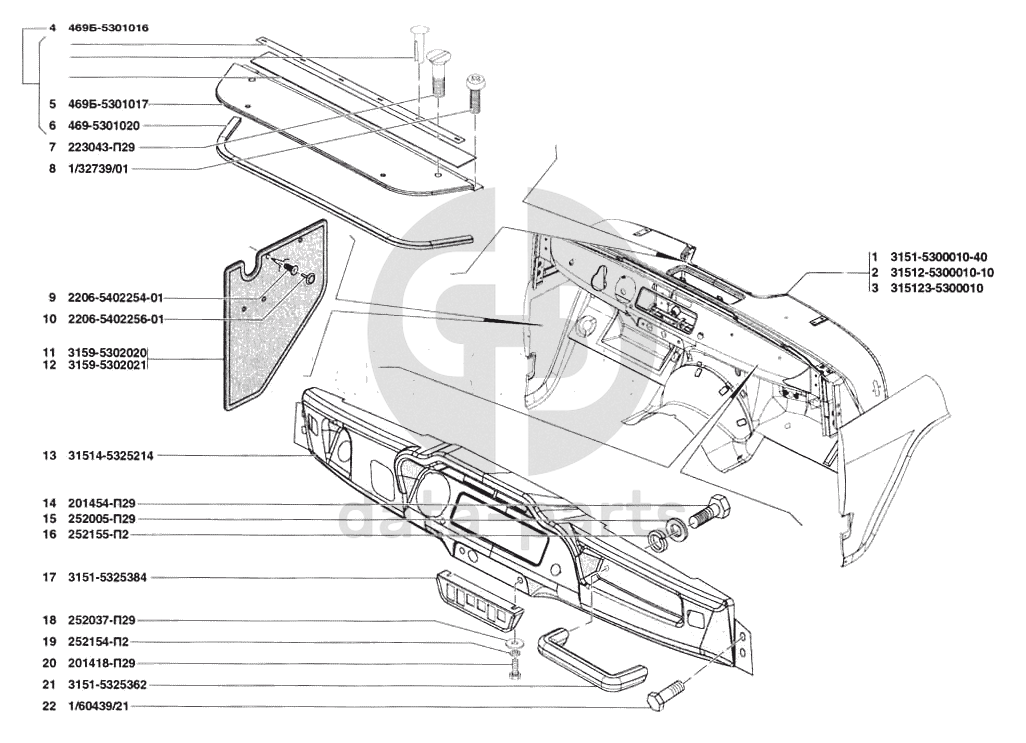Передок в сборе, детали передка, обивка передка, панель приборов УАЗ 31519