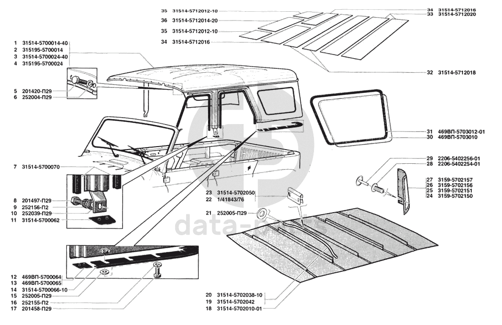 Крыша в сборе, обивка крыши, окно крыши, термошумоизоляция крыши УАЗ 31519