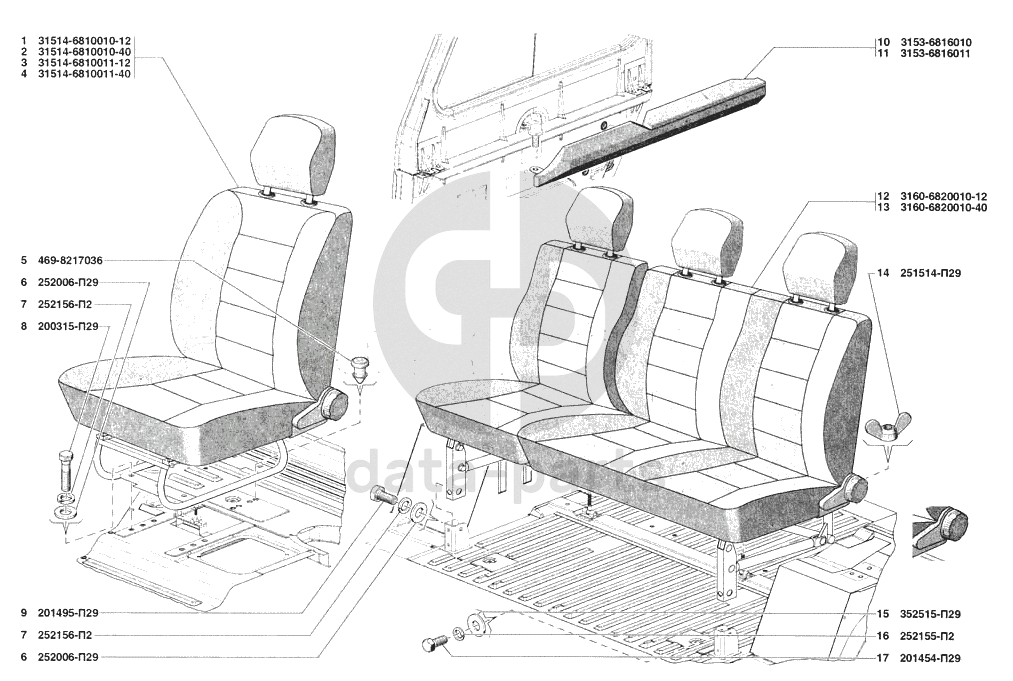 Сиденье водителя, подлокотник, сиденье заднее УАЗ 31519