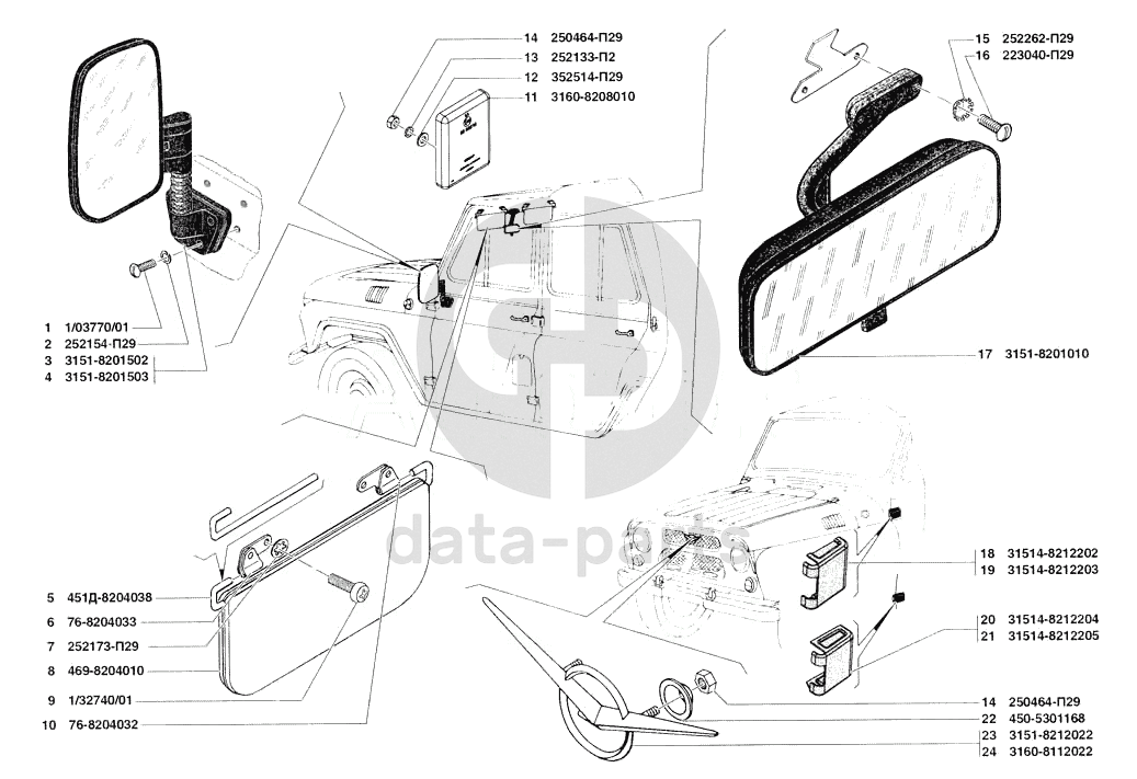 Зеркала, козырек противосолнечный, отражатели света, орнаменты УАЗ 31519