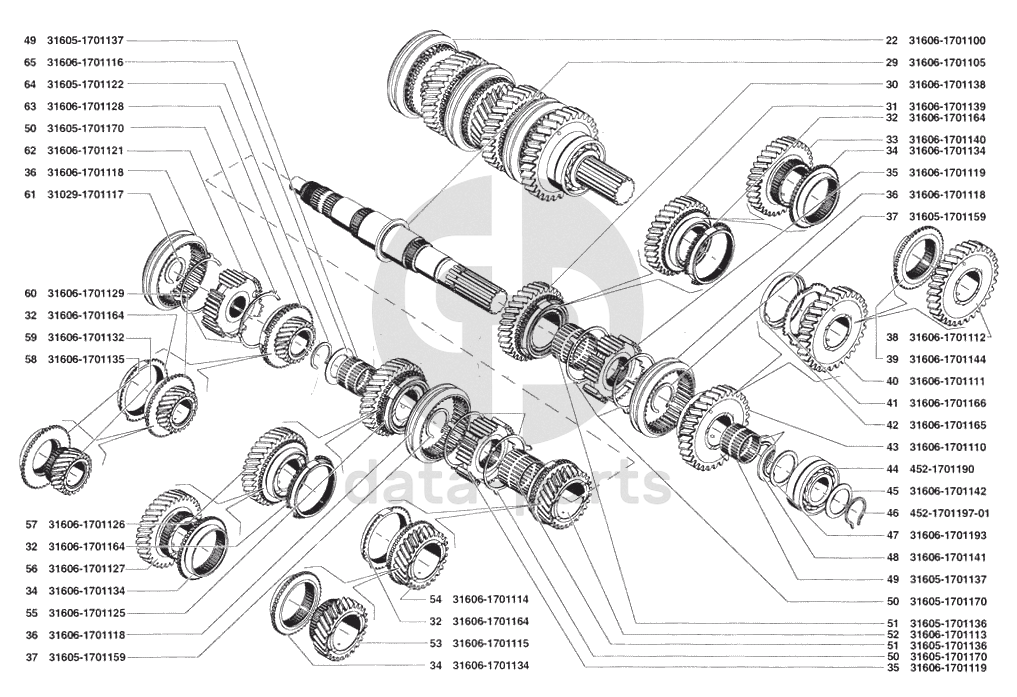 Вал вторичный с шестернями в сборе