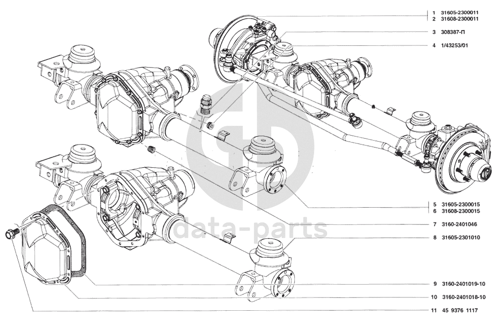 Мост передний ведущий в сборе, картер и кожухи полуосей переднего моста УАЗ 31519