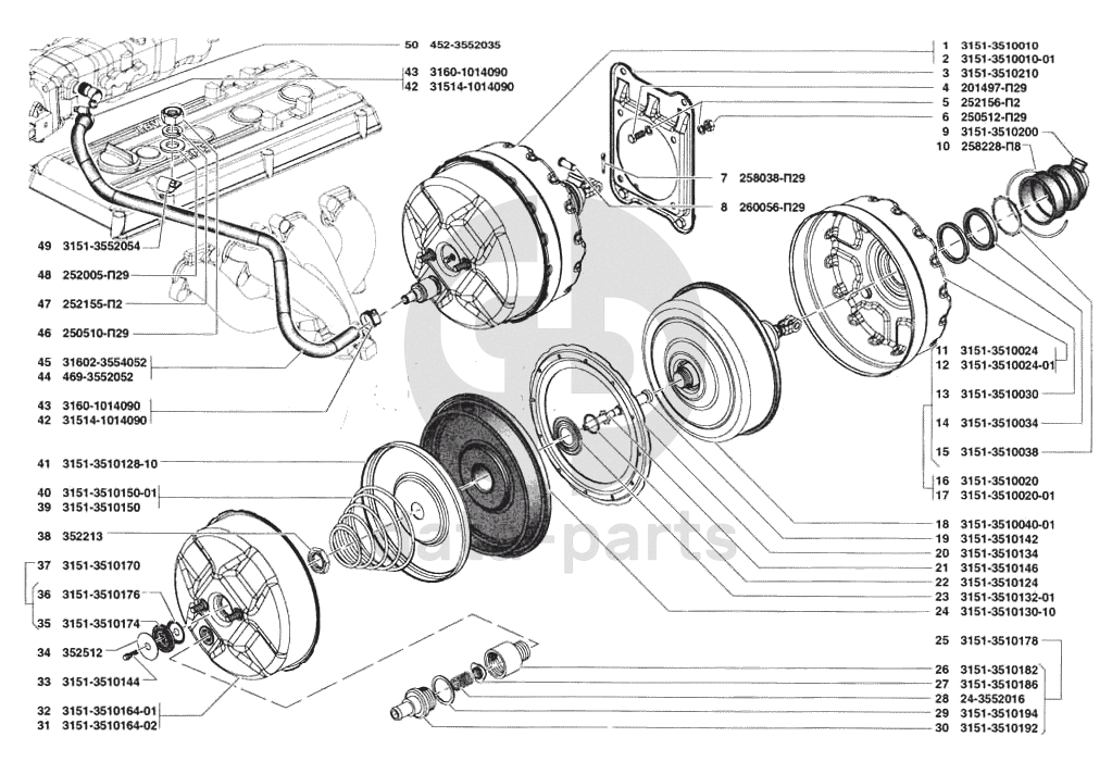 Усилитель вакуумный тормоза, трубопровод вакуумного усилителя УАЗ 31519
