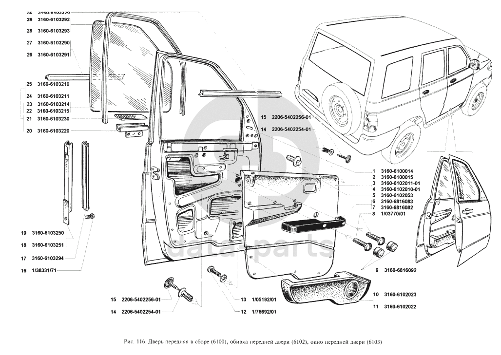 Двери передние в сборе, обивка передней двери, окно передней двери УАЗ 3160