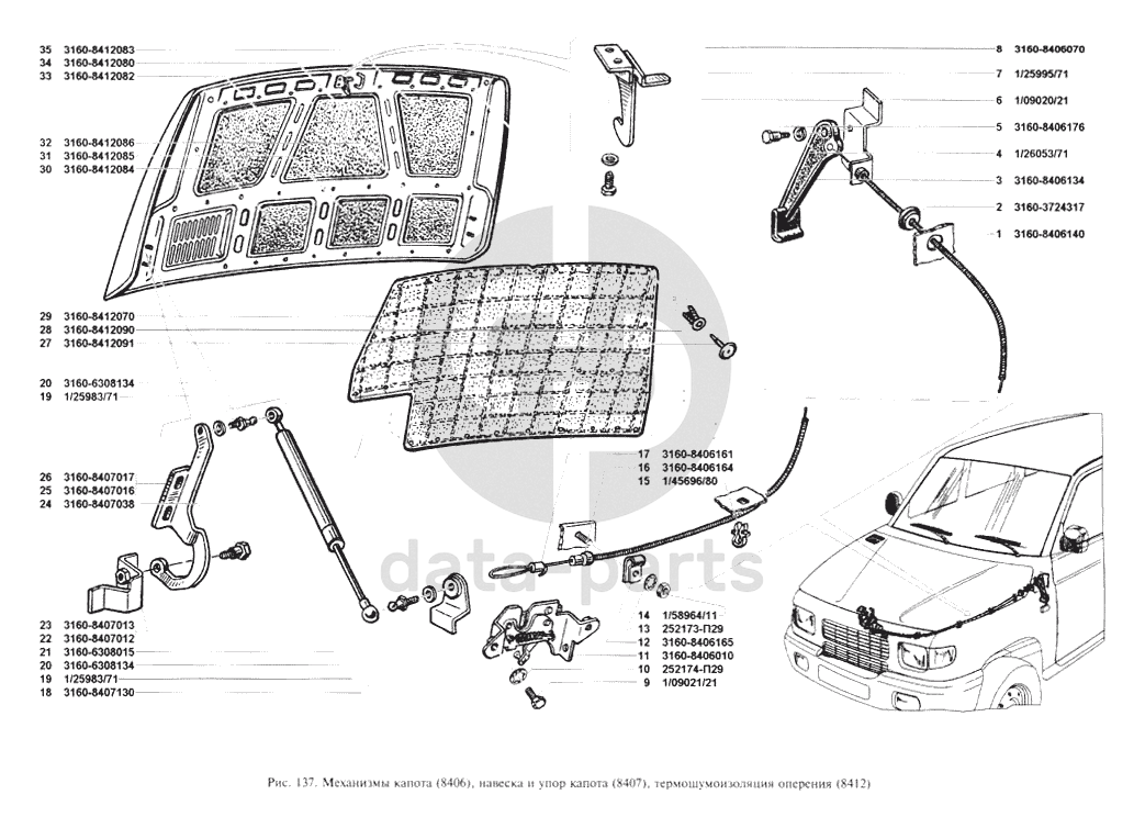 Механизмы капота, навеска и упор капота, термошумоизоляция оперения УАЗ 3160