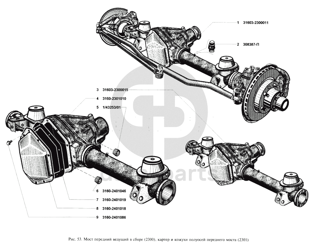 Мост передний ведущий в сборе, картер и кожухи полуосей переднего моста УАЗ 3160