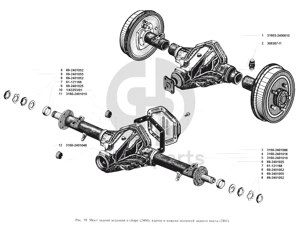 Мост задний ведущий в сборе, картер и кожухи полуосей УАЗ 3160