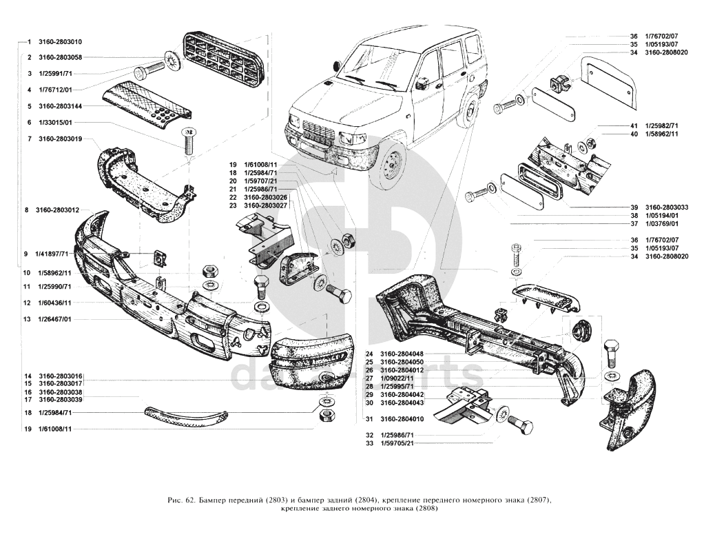 Бампер передний, бампер задний, крепление переднего номерного знака, креплеие заднего номерного знака УАЗ 3160