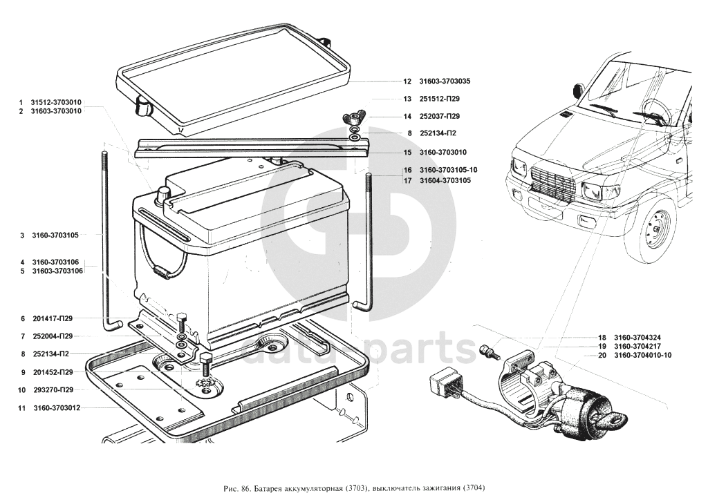 Батарея аккумуляторная, выключатель зажигания УАЗ 3160