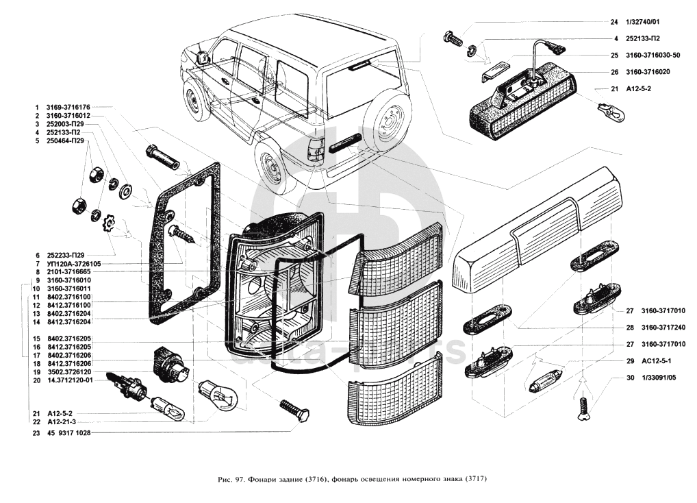 Фонари задние, фонарь освещения номерного знака УАЗ 3160