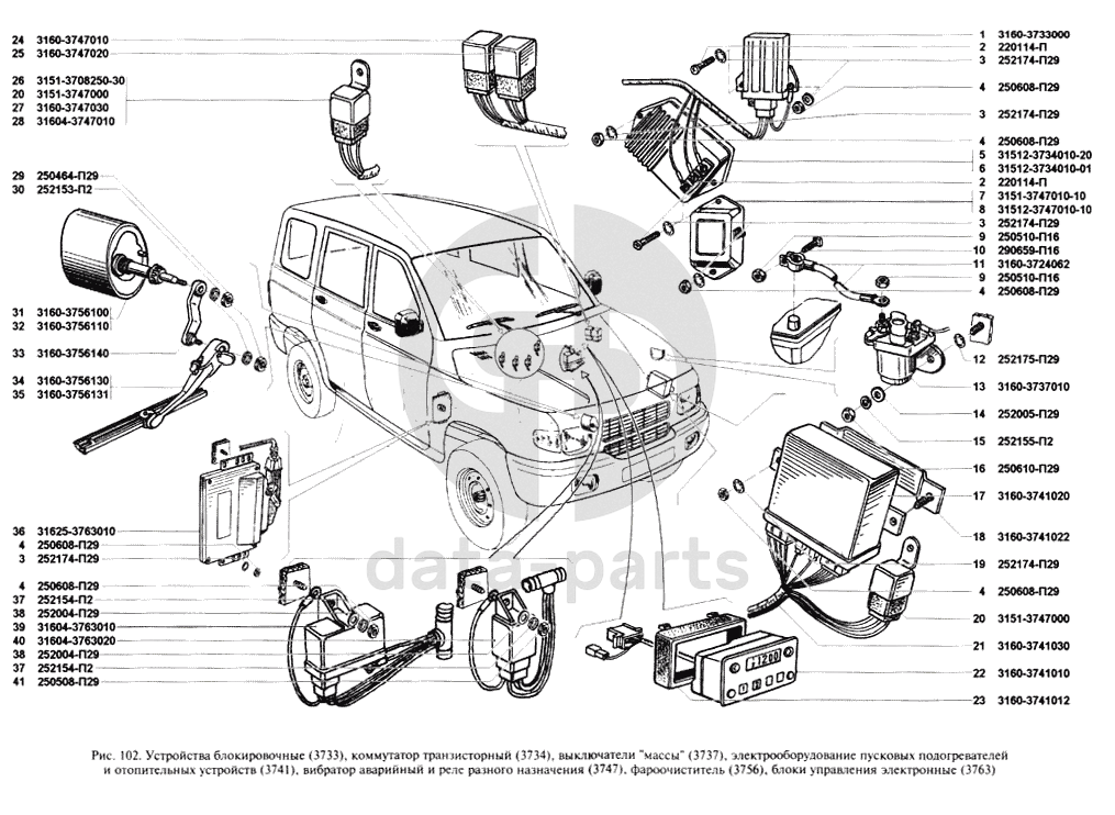 Устройства блокировочные, коммутатор транзисторный, электрооборудование пусковых подогревателей и отопительных устройств (устанавливается в комплектации с отопителем-подогревателем), реле разного назначения, фароочиститель, блоки управления УАЗ 3160