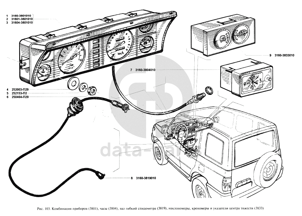 Комбинация приборов, часы (устанавливается в зависимости от комплектации), вал гибкий спидометра, наклономеры, креномеры и указатели центра тяжести (устанавливается в зависимости от комплектации) УАЗ 3160