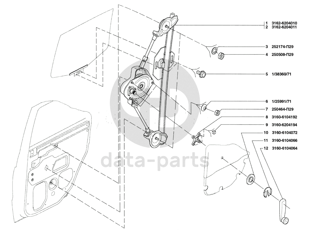 Механизм перемещения стекла задней двери правый