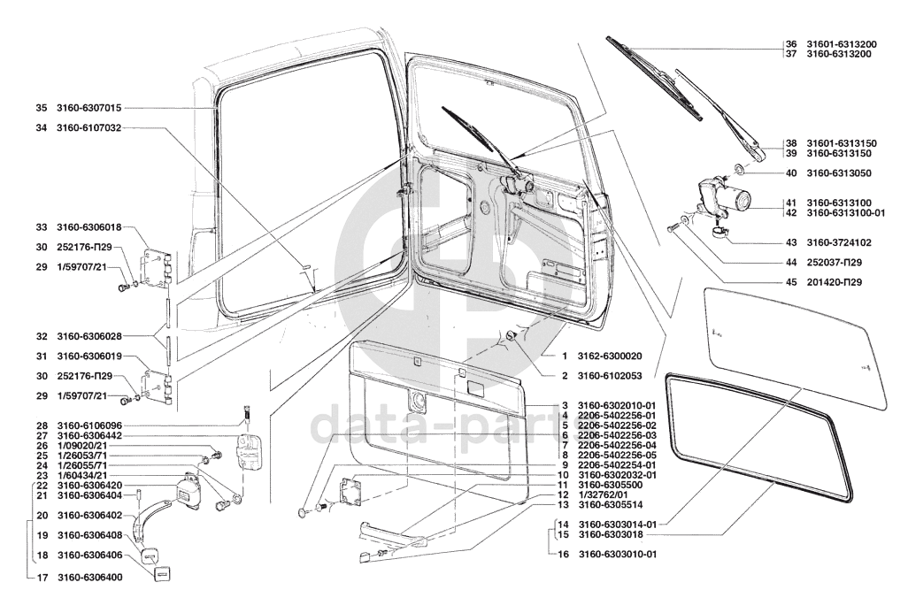 Дверь задка в сборе, обивка двери задка, окно двери задка, навеска двери задка, уплотнители двери задка, стеклоочиститель двери задка UAZ Patriot