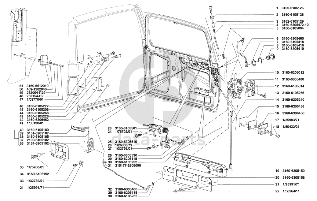 Замок и ручки двери задка, блок электронный управления электроблокировкой замков двери и исполнительные органы UAZ Patriot