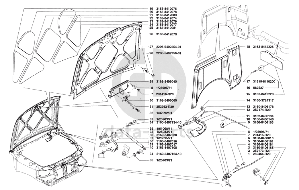Замок и привод замка капота, навеска и упор капота, термошумоизоляция оперения UAZ Patriot