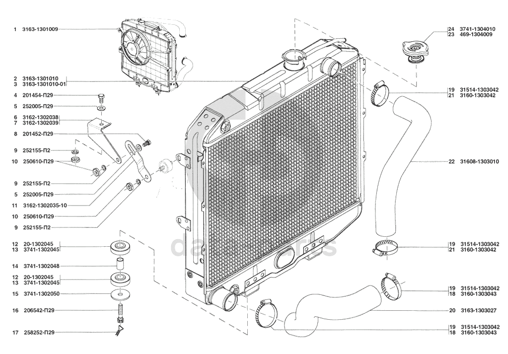 Радиатор, подвеска радиатора, трубопроводы и шланги, пробка радиатора UAZ Patriot