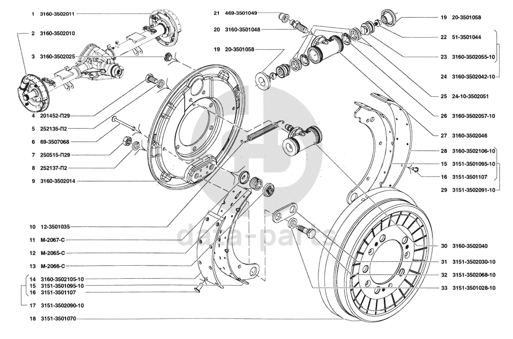 Тормоза рабочие задние и тормозные барабаны UAZ Patriot