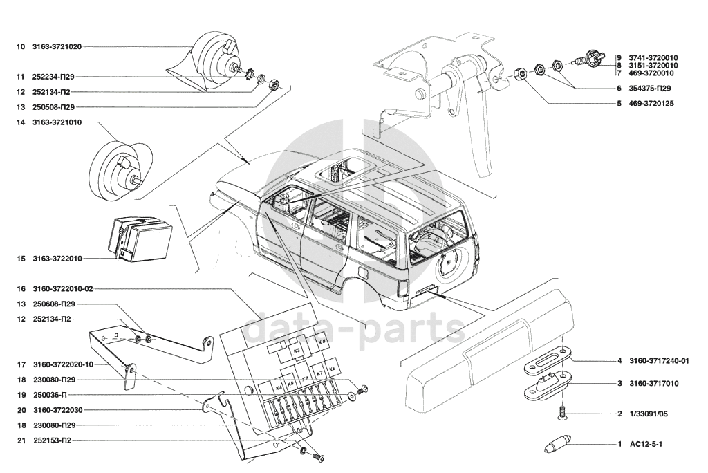 Фонарь освещения номерного знака, выключатели сигнала торможения, сигналы звуковые, предохранители электрических цепей UAZ Patriot