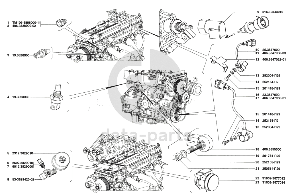Датчик температуры, датчик давления масла, датчик скорости, датчик фазы, датчик детонаций, датчик массового расхода воздуха UAZ Patriot